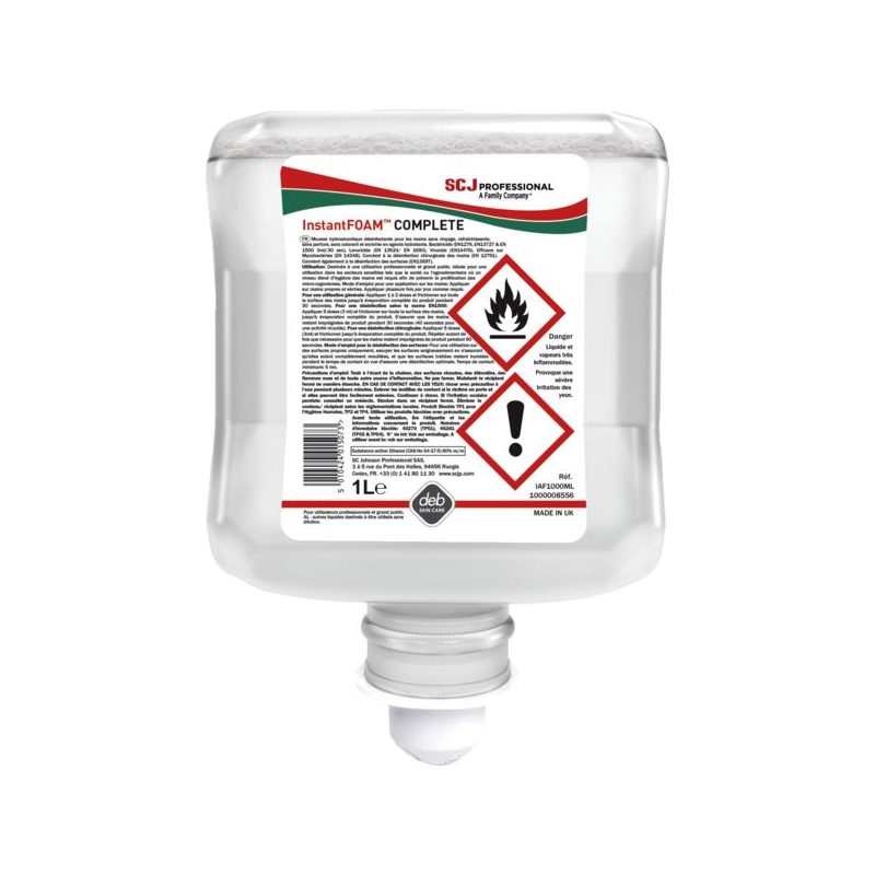 Mousse désinfectante hydroalcoolique avec agents hydratants pour les mains, extrêmement efficace, sans parfum ni colorant. S’utilise sans eau et élimine 99,999% des germes les plus courants en 30 secondes seulement. Formule hypoallergénique adaptée à un usage fréquent, non altérante et compatible avec les gants en latex, vinyle et nitrile, idéale pour une utilisation au contact des aliments. Certifié ECARF, convient aux peaux sensibles et sujettes à l'eczéma. Utilisation : secteurs où un niveau d'hygiène élevé est requis, secteur médical, agroalimentaire, restauration collective, bureau Conforme à la Réglementation Européenne Biocides n°528/2012. Conforme aux normes bactéricides (EN1500, EN12791, EN1276, EN13727), levuricide (EN1650, EN13624), mycobactéricide (EN 14348) et virucide (EN14476). Utilisez les biocides avec précaution. Avant toute utilisation, lisez l'étiquette et les informations concernant le produit.
