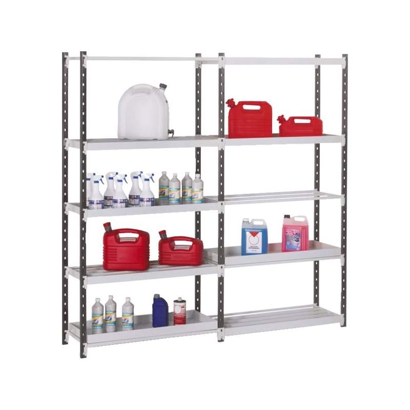 Composé de 5 niveaux en tablettes tubulaires à connecteurs réglables au pas de 62,5 mm. Idéal pour le stockage de pièces mécaniques, bacs plastiques, outillage. En option, dessus de tablette préconisés pour le stockage de petites pièces, en isobois de 2,5 mm d'épaisseur. Utilisation en simple et double face. Tablette monobloc rigide, permettant un montage et démontage très rapide, sans outils ni visserie. Finition peinture époxy montants bleus et tablettes gris perle. Livré démonté. Autres dimensions, configurations et coloris disponibles sur consultation. Capacité de charge : jusqu'à 250 kg uniformément réparti selon configuration. H x l : 2000 x 1000 mm Poteaux gris anthracite (RAL 7024) et tablettes gris perles (RAL 7035)